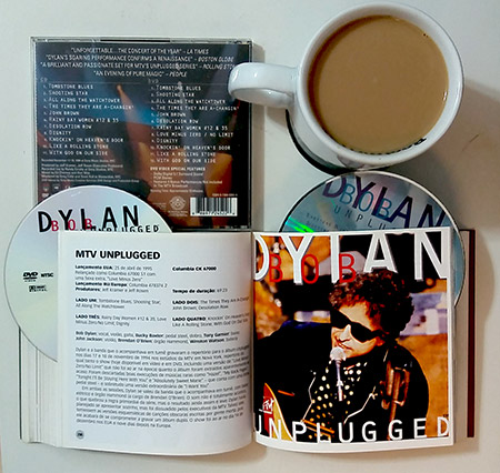 Bob Dylan com café, dia 38: Após dois discos de covers de blues rurais, todos os fãs aguardavam um álbum de canções inéditas de Dylan, mas numa pausa da Turnê Sem Fim, Bob adentrou os estúdios da MTv em Nova York nos dias 17 e 18 de novembro de 1994 para gravar um programa Unplugged ao lado da banda que o escudava na estrada mais Brendan O’Brein (posteriormente multiplatinado produtor) no órgão Hammond, o que já entrega um acústico não tão acústico assim (quase praxe na série televisiva), ainda que Bob tenha sugerido apresentar-se solo ao violão – foi dissuadido pelos executivos da MTv. A versão em CD de “MTv Unplugged Bob Dylan” foi lançada em 1995 (o DVD só chegaria ao mercado em 2004), bateu na 23ª posição da Billboard e na 10ª no Reino Unido, e cativa em revisões que atualizam (e ás vezes até amaciam) o repertório do bardo para novas gerações (ao menos em versões oficiais, já que no próximo show ele poderia cantar e tocar tudo de uma forma diferente, novamente e novamente e novamente). Nos dois dias de gravação, Bob Dylan tocou 20 músicas sendo que 12 delas foram oficializadas em CD e DVD (entre outras, ficaram de fora “Everything Is Broken”, “I Want You” e ‘My Back Pages” – os bootlegs “Uncut Unplugged” e “Completely Unplugged” trazem os dois dias na integra).