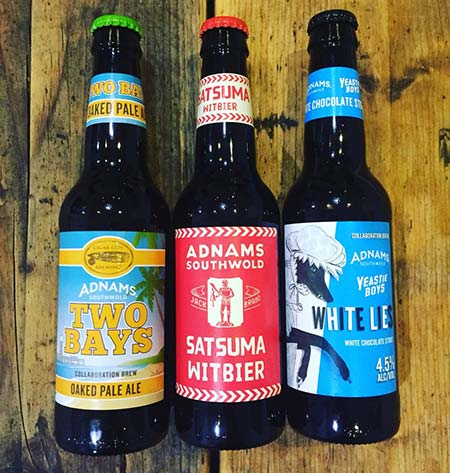 De Southwold, Suffolk, mais três novidades da inglesa Adnams, duas delas colaborativas, chegaram ao Brasil nesta semana via importação da Get Trade, braço da Get – Cervejas Especiais, dando continuidade a série de lançamentos da cervejaria inglesa no Brasil – só neste ano já baixaram por aqui cinco cervejas da linha Jack Brand (Flat White Porter, Crystal Rye IPA, Ease Up IPA, Mosaic Pale Ale e Clementine Pale Ale) mais a Wild Hop Amber Beer e a Blackshore Stout. Desta vez estão chegando a Two Bays Oak Pale Ale (colab com a Cigar City), a White Lies (colab com a Yeastie Boys) e a Satsuma Witbier.