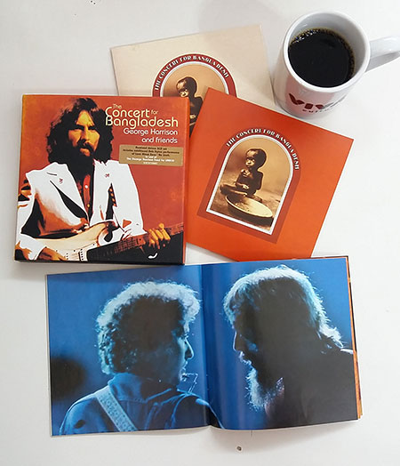 Bob Dylan com café, dia 69: No dia 01 de agosto de 1971, Bob subia em um palco pela terceira vez em cinco anos, mais precisamente desde o acidente de julho de 1966, para um concerto beneficente organizado por George Harrison no Madison Square Garden, em Nova York. Antes disso, Dylan tinha se apresentado apenas junto com a The Band no Carnegie Hall num tributo em homenagem a Woody Guthrie em janeiro de 68, e no Festival da Ilha de Wight em agosto de 69, por uma quantia enorme de dinheiro (50 mil dólares) conseguida por seu então empresário, Albert Grossman (este show está presente no volume 10 das Bootleg Series). “Depois de uma série de desastres naturais e uma sangrenta guerra civil, o recém-criado estado de Bangladesh estava enfrentando um desastre humanitário em 1971”, conta Howard Sounes em “Dylan, a Biografia”, lançada em 2002 no Brasil. “O músico Ravi Shankar levou a situação do povo de Bangladesh à atenção de George Harrison na esperança de que ele pudesse fazer alguma coisa para ajudar. Depois do sucesso de um disco (“All Things Must Pass”) e de um single no primeiro lugar das paradas, o ex-beatle organizou dois shows beneficentes monumentais no Madison Square Garden, um de tarde, outra na noite de 01 de agosto de 1971 (com cerca de 20 mil pessoas em cada sessão). Os shows seriam gravados para um álbum ao vivo e um filme, e os lucros iriam para a UNICEF”, explica Sounes.