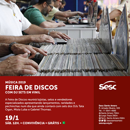Visando atender a esse público tanto quanto mostrar (na prática) para àqueles que ainda não têm ideia de que os discos de vinil movimentam um grande mercado na atualidade, a Feira de Discos SESC Santo Amaro, produzida por Marcelo Costa (Scream & Yell), Rafael Cortes (Assustado Discos) e Beth da Matta reunirá no próximo dia 19 dezembro lojistas, selos e vendedores especializados apresentando lançamentos, raridades e pechinchas num dia que ainda contará com sets de renomados DJs militantes na cultura do vinil.