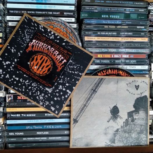 Neil voltaria para a Reprise em 1988 com um disco de blues, “This Note’s for You”, em que ele acrescentaria metais na Crazy Horse e a batizaria de The Bluenotes, e um EP, o maravilhoso “Eldorado”, que seria o embrião de “Freedom” (1989), o álbum que colocaria sua carreira nos eixos e o aproximaria da cena grunge. Seis anos depois, ele iria entrar em um estúdio em Seattle tendo o Pearl Jam como banda de apoio acompanhado do produtor Brendan O’Brien para compor “Mirrorball”, seu 21º álbum de estúdio! Young escreveu todas as faixas do álbum, exceto “Peace and Love”, co-escrita por Young e Eddie Vedder – duas faixas de Vedder (“I Got Id” e “Long Road”) saíriam no EP “Merkinball”, do Pearl Jam (com Neil na guitarra e nos backings).