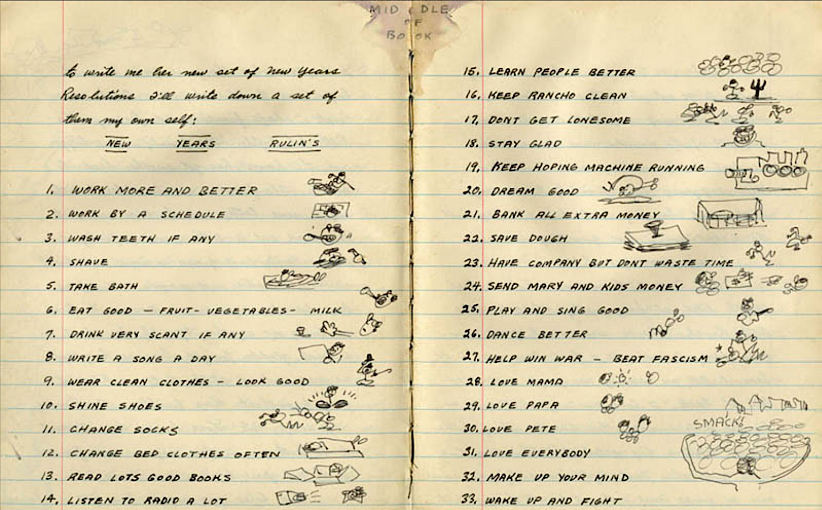 “Você pode ouvir as músicas de Woody Guthrie e realmente aprender a viver”, disse Bob Dylan certa vez. O homem que tocava com um violão que trazia um adesivo “This machine kills fascists” (Esta máquina mata fascistas) publicou sua lista de pedidos e resoluções de ano novo no primeiro dia de 1943 a pedido de um jornal. O rascunho dos pedidos é esse aqui abaixo.