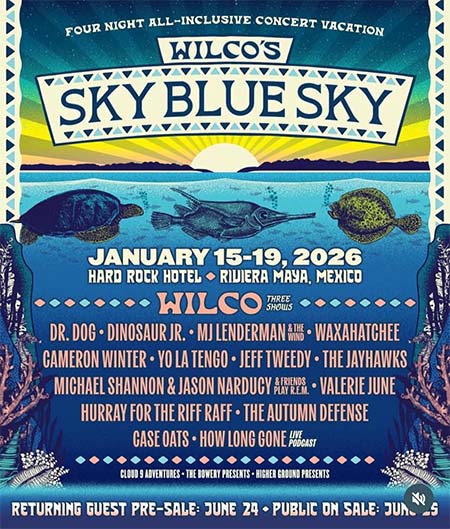 O Wilco, que é destaque na capa do Scream & Yell hoje (são vários os momentos imperdíveis da conversa da banda com a imprensa em São Paulo pré-C6 Fest – não deixe de ler!!), anunciou o line-up completo da edição 2026 de seu festival Sky Blue Sky, com “4 noites repletas de música, workshops, comodidades com tudo incluído e muito mais”, em um resort no México.