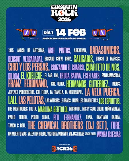 O festival argentino Cosquín Rock 2026 revela seu line dividido por dias para a edição que acontece em fevereiro com Fito Paez, Babasonicos, Franz Ferdinand, Devendra, Chemical Brothers e mais!