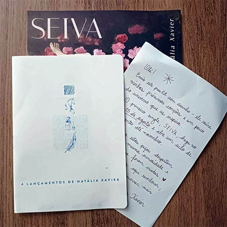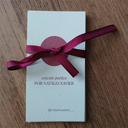 Trata-se de um postal que marca o lançamento de quatro singles da Natália (“Seiva”, o primeiro, já está nas plataformas), um livretinho de 8 páginas com as letras e a ficha técnica dos singles ( <3 ), uma cartinha e um “oráculo poético” em 10 cards que chamou a atenção do Martín, o que por sua vez chamou a minha atenção: se você consegue a atenção de uma criança de seis anos, algo tem.