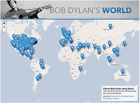 Para festejar os 72 anos de Bob, em 2013, o site Slate montou um mapa interativo com referências a trechos de dezenas de músicas de Dylan. O resultado você confere aqui. Dica boa do Dylanesco!