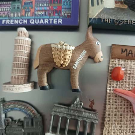 Acontece que o trajeto é uma escada de, sei lá, um metro e meio de largura (se muito) e uns 500 degraus daqueles espaçosos, com uma muretinha baixinha separando a montanha (e os burricos) do azulzissimo e deslumbrante Mar Egeu lá embaixo. Numa situção normal, Lili nunca se aventuraria, e nem eu. Mas cá estamos com um imã de burrico em nossa geladeira, e um filho querendo viver a mesma aventura. Dessa vez, subirei a pé…