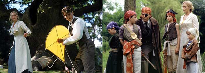Nos moldes da peça original, o tom do filme é de fantasia. Um escritor perdido encontra inspiração em uma família, começa a freqüentar a casa deles, se aproxima dos meninos e passa a anotar em um diário as aventuras que vive com essa turminha. Há a bruxa, há o zangado, há piratas e, sobretudo, existe o outro lado da história, com um casamento fracassado às vésperas de acabar. A maneira com que a história é contada pega o espectador no colo e o faz ninar. Se você chorar, não se assuste, com toda certeza você não foi o único. Sobretudo, o filme faz sonhar de uma maneira que raramente o cinema tem conseguido fazer atualmente. Mas, é necessário que se diga, o mundo de inspiração de Barrie é esse mundo em que você e eu vivemos. Mesmo sua Neverland é um mundo mágico, mas com objetos reais. A inspiração surge das pequenas coisas, das coisas simples.