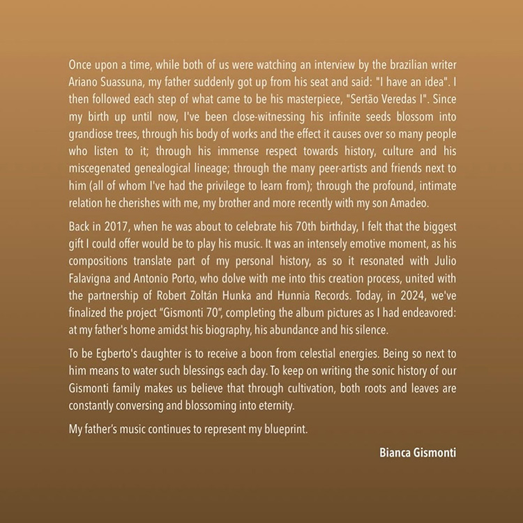 Em momento algum, porém, Bianca Gismonti desistiu do projeto. “Homenagear e agradecer ao meu pai terá sentido durante todas as existências que eu tiver”, conta a pianista, que gravou o álbum ao lado de Julio Falavigna (bateria) e Antônio Porto (baixo). No repertório, há standards do repertório de Egberto, como “Palhaço”, “7 Aneis” e “Água e Vinho”, mas também lados-B, incluindo algumas canções com letra – faceta menos presente da obra do compositor nascido em Carmo (RJ), especialmente após os anos 1970.