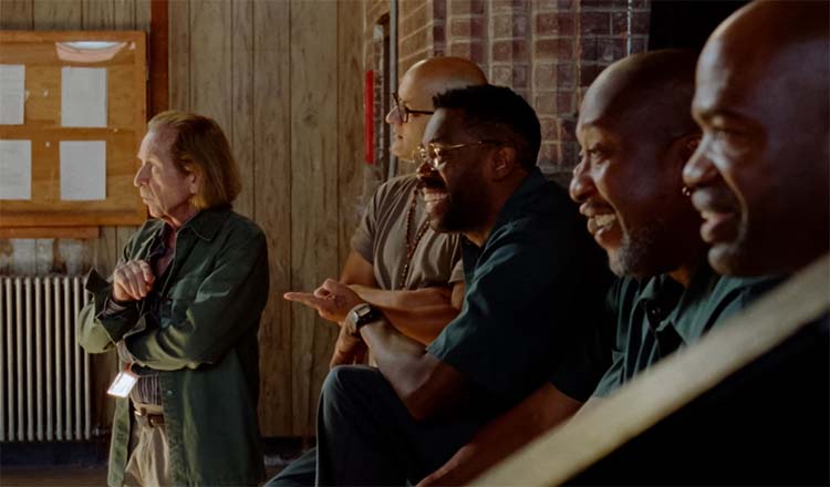 Liderando o elenco de atores não profissionais está Colman Domingo, profissional cuja presença em diversas produções e atuação constante nos palcos, define bem a ideia de ator/operário. Em “Sing Sing”, ele representa John “Divine” G. Whitfield, o detento real e um dos fundadores do programa de teatro dentro do presídio. Domingo, com sua postura de homem comum, o chamado “everyday man”, transmite bem a presença necessária diante de atores não profissionais com os quais atua. Em suas cenas, principalmente aquelas junto a Clarence Maclin, que interpreta a si mesmo, encontra, por escolha do próprio Domingo, uma igualdade necessária de pares. Válido salientar que, mesmo tendo em “Sing Sing” seu primeiro filme (e, já de cara, uma indicação ao Oscar – o filme também foi indicado nas categorias Melhor Roteiro Original e Melhor Canção Original), Maclin não fica para trás e entrega, ao lado do experiente ator protagonista, uma presença em cena que não se reduz somente a uma animosidade ou marra advinda de seu personagem presidiário.