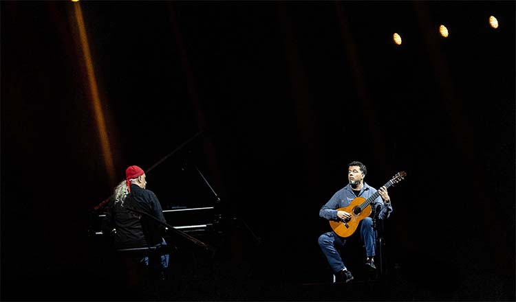 Egberto subiu em cena com 15 minutos de atraso, explicou que alguém do seu círculo pessoal tinha falecido e que, por isso, se apresentaria abalado. Atacou três composições ao piano, entre as quais “Miudinho”, de Villa Lobos. E com essa abertura, solitário sobre o palco, parece ter retomado o controle dos nervos. Com Daniel em cena, revezando hora duo piano-violão, hora duo violão de 10 cordas-violão de 6 cordas, a apresentação passa a ser assombrosa do ponto de vista do que músicos de elevadíssimo nível são capazes.