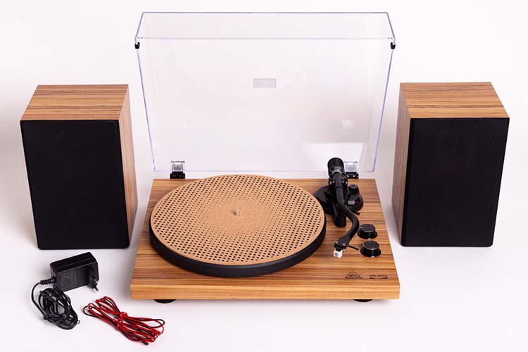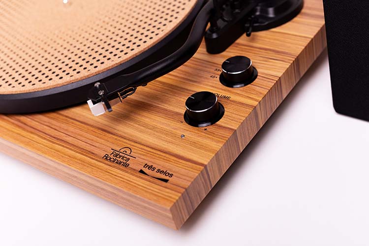 Bruno Vieira: Temos um time na Fábrica Rocinante que cuida do controle de qualidade. Todo disco que sai da fábrica é escutado em diferentes vitrolas, para ver como cada disco performa antes de ser liberado. É super importante saber que nossos discos vão ser bem ouvidos, sem pular, com a experiência do vinil que acreditamos. Ao longo do tempo, entendemos que um bom toca-discos teria de ter algumas características. Um é o anti-skating, que a maioria dos produtos de entrada não têm. Outro é um peso no braço, para equilibrar e controlar. Queríamos o braço curvo, também. Antes de definir um modelo, conversamos com vários fabricantes, fizemos testes, ficamos meses ouvindo para entender o tempo de vida de cada equipamento. Pegamos também inputs das redes sociais, daquelas dúvidas de “tem que ter amplificador, tem que ter pré-amplificador?”. Aí, chegamos nesse modelo, que juntou o design, um bom braço e traz junto as caixas de som – algo que achamos importante. A ideia é ser um modelo de entrada, com qualidade excelente para quem está começando ou até que já está no meio da jornada do vinil.