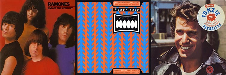 E o terceiro… Eu nem lembro o nome do disco, preciso procurar. Era meio que um disco de exploração comercial, tinha só músicas dos anos 1950 e 1960, com uma foto enorme do Fonzie na capa (Nota: o disco é provavelmente chamado de “Fonzie Favorites” e saiu em 1976). Eu tinha uns 7 anos quando comprei, na época em que Happy Days era o maior sucesso da TV – eu era fissurado em Happy Days. Basicamente era um disco cheio de clássicos dos anos 1950 e 1960 — Coasters, Bobby Darin com “Splish Splash”, várias daquelas músicas que eram hits daquela época. Mas o mais curioso é que em cada lado do vinil, a última faixa era um esquete com dubladores. Tinha um cara imitando o Fonzie (não era o de verdade, dava pra notar), fazendo essas encenações de “ficar de boa com os amigos”. E também tinha o tema de Happy Days, a música da abertura do seriado.