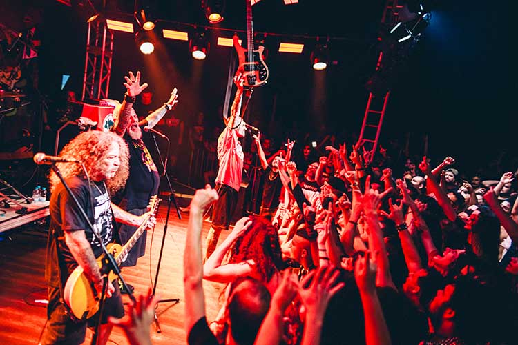 Logo depois, o stoner poderoso dos goianos da Hellbenders fez o público balançar cabeças e corpos com uma apresentação impecável, com riffs pesados preparando o terreno para o que viria a seguir. Antes do show final, o organizador Léo Bigode subiu ao palco e pediu calma à plateia, que se acotovelava para passar por uma das portas emperradas do Yguá. Pediu cuidado mútuo e tranquilidade, lembrando que a celebração só faria sentido se todos pudessem aproveitá-la juntos.