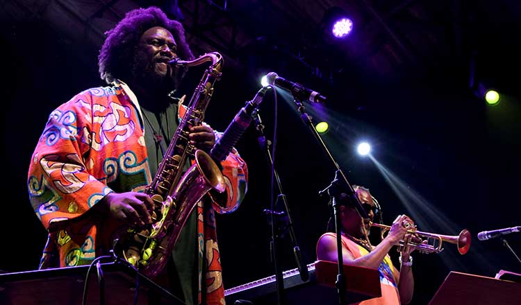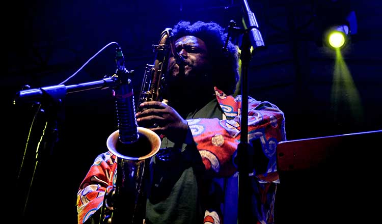 Ao entrar no palco meia hora depois de Ferr, Kamasi Washington é aplaudidíssimo já de partida. É claro que seu histórico o credencia para tal, ao não só ter renovado o repertório do jazz nos últimos 15 anos, mas também ao ter proposto conexões do clássico gênero americano com abordagens mais contemporâneas – do rap de Kendrick Lamar aos animes de Shinichirō Watanabe (o criador de “Cowboy Bebop” e também do recente “Lazarus”, que contou com a participação do saxofonista na trilha sonora, foi tema da conversa com Kamasi aqui no Scream & Yell). Além disso, só por sua presença corporal e pela forma como se introduz sob a ribalta, Kamasi já chama a atenção. Mas é interessante notar como parte do público parece aplaudi-lo só por existir, sem exatamente se importar com o que será apresentado a seguir.
