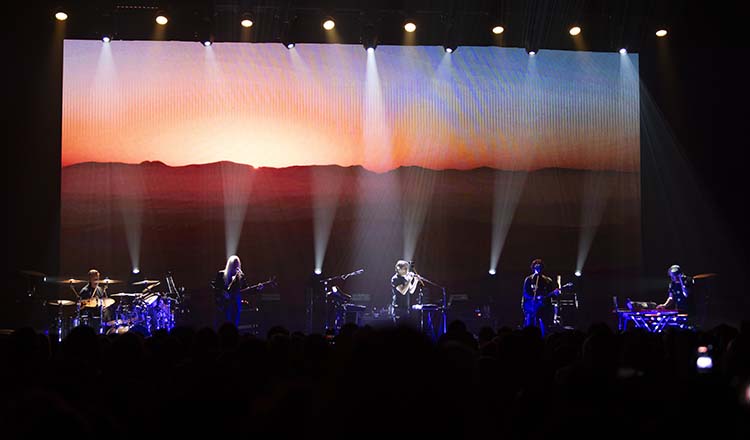 Projeções monumentais, luzes coreografadas e timbres que pareciam em rotação orbital criavam uma paisagem quase cósmica. O som ganhava corpo nas mãos da banda formada por Nick Beggs (baixo e Chapman Stick), Randy McStine (guitarra), Adam Holzman (teclados) e Craig Blundell (bateria). Cada músico entende o papel de ser parte de um sistema, sem ego, sem exibicionismo. Tudo ali serve à imersão. E o público agradece.