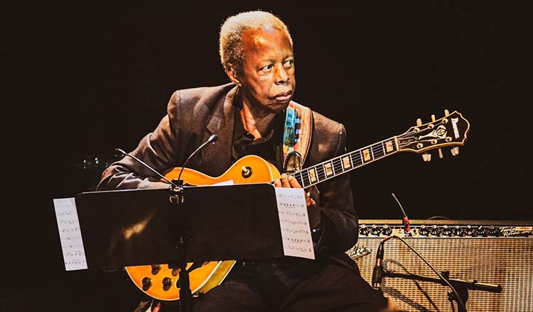 Após as primeiras canções da noite, Salvador faz uma pausa para agradecer ao público e ao Sesc pela recepção, e anuncia a primeira participação da noite: Armando Marçal (percussionista com um currículo extenso de participações em discos de MPB e instrumental), que aumenta ainda mais o tempero brasileiro e afrolatino nos arranjos do grupo. Na sequência, outra participação, agora com Zé Carlos (guitarrista que fez parte do Abolição, conjunto formado por Dom Salvador nos anos 1970 – foto abaixo) caprichando nas bases rítmicas e solos inspirados em sons como “Meu Fraco é Café Forte” e “Gafieira”, que ainda contaram com intervenções de bateria e percussão quase remetendo a uma escola de samba em pleno Carnaval.