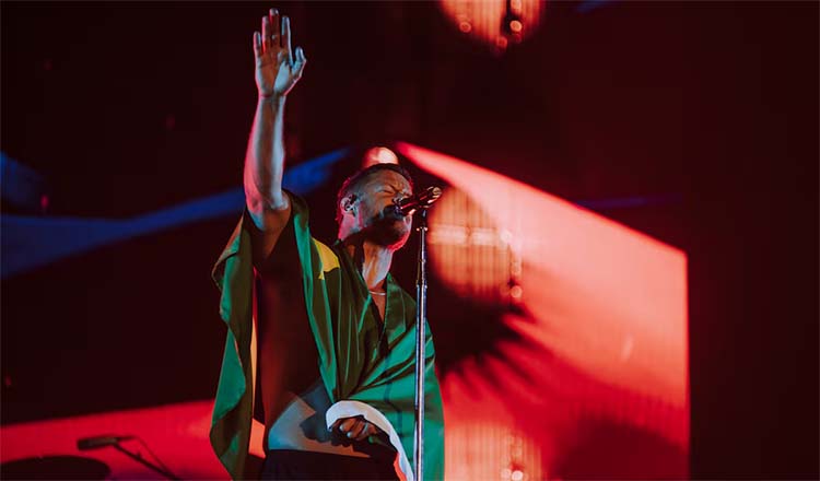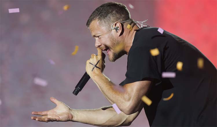 Após uma curta, porém correta e apaixonada apresentação da Lagum (que soltaram seu último disco, “As Cores, as Curvas e as Dores do Mundo”, neste mesmo 2025), a apresentação dos headliners começou, pontualmente, às 21hs. Efeitos de luz, telões gigantes e animações extravagantes anteciparam a entrada dos membros – com o percussionista Andrew Tolman – frente a um estádio completamente lotado. Foi impressionante a devoção e a paixão dos fãs em relação aos músicos, e, em especial, ao frontman. Dan Reynolds, aliás, parece saber exatamente o que seus admiradores esperam, e não perde tempo em entregar: já na faixa de abertura, “Fire In These Hills”, o cantor percorre a passarela que o leva ao meio do público (lugar onde, aliás, ele passa a maior parte da apresentação) de shorts e sem camisa, exibindo o corpo musculoso que o transformou em sex symbol. E a participação do público é notável: já em “Thunder”, a segunda faixa, o coro da audiência pôde ser ouvido quase tão alto quanto os próprios instrumentos, senão mais.