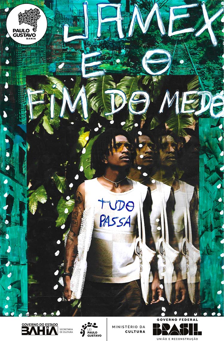 Entre as ruas de Amaralina e o Rio Vermelho, vi pichações que me intrigavam pela potência e amplitude de um pequeno manifesto urbano: “fim do medo”. A imagem dessa frase em um muro rachado já parecia cinematográfico por si só, mas quando conheci Jamex através da produtora do filme, Luísa Maciel, pareceu natural propor que filmássemos algo a partir do cotidiano dele com a cidade. Foi aí que, em 2022, realizamos um curta totalmente livre chamado “Jamex em Busca de Tela”, uma espécie de filme-pesquisa que nos deu a base inicial pra elaboração de um roteiro aberto às mesclas do real com ficcional. A gente queria realizar uma espécie de documentário fabulado, delírio cru do real, onde pudéssemos fazer essa crítica a partir de cinema irreverente, “gastão”, um cinema que brinca ao mesmo tempo que questiona formatos. Jamex realiza seus trabalhos em todo tipo de suporte, de madeira a telas de tecido, nos muros da cidade, tudo que é, enfim, pintável. Ao passo que senti que há no modo de trabalho dele um espelhamento do meu modo de fazer cinema. Um pintor que cruza a cidade pra entregar seu trabalho, que no final das contas é parecido com o corre de tantos outros trabalhadores. Nesse processo, Jamex me apresentou outros vídeos e filmes que outros realizadores haviam feito com ele. Era evidente que a figura dele era cinematográfica. E foi massa ver esses filmes e perceber que nos interessava inventar uma outra coisa, não realista, meio que uma distopia de quintal, onde pudéssemos usar tudo a favor do filme, inclusive o que não desse certo na produção. Queríamos pensar nessa arte como delivery, como produto, que apesar de pertencer a um universo de aparente prestígio, não garante nada ao trabalhador da arte, menos ainda a um artista periférico. Esse tema nos guiou inicialmente e nos fez encontrar temáticas paralelas ao longo do processo.