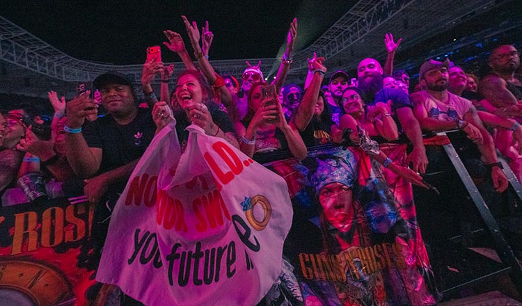Ao reduzir o tempo de apresentação e abrir mão de escolhas mais óbvias, como “Don’t Cry” e “Patience”, a banda evitou a armadilha da previsibilidade absoluta e organizou um set mais funcional, mais pensado para fluxo do que para acúmulo. “Welcome to the Jungle” abriu com o tipo de catarse que nenhuma outra banda do dia havia provocado, e o bloco inicial, com “It’s So Easy”, “Mr. Brownstone” e “Bad Obsession”, manteve o show em movimento constante, sem dispersão. No meio disso, “Live and Let Die” apareceu como primeiro grande pico, tanto pelo impacto sonoro quanto pela resposta imediata do público.