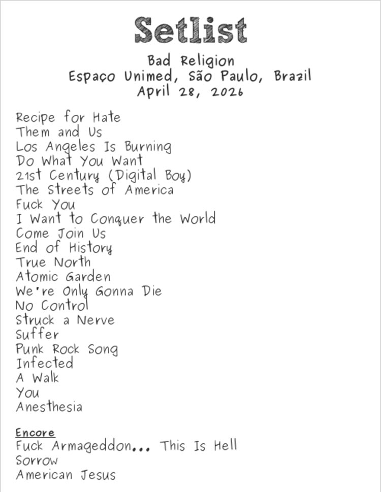 Em um mundo cujos fãs do Pink Floyd criticam Roger Waters por “misturar música e política”, não seria de se estranhar que alguém presente no Espaço Unimed não soubesse da história da banda, por isso, se posicionar, por exemplo, contra a guerra, contra o ICE e contra a política armementista e expansionista de Donald Trump é algo óbvio, mas obrigatório, ainda mais para uma banda punk. Pois lutar pela democracia é um ato diário. E incansável. Em São Paulo, por cerca de 80 minutos (e 24 canções de 12 álbuns), o Bad Religion delegou a defesa da liberdade a seus fãs. Não podem reclamar se quando voltarem, no ano que vem, estivermos vivendo numa ditadura. Afinal, o demônio mora nos detalhes. E não perdoa os inocentes. Tenha sempre isso em mente.
