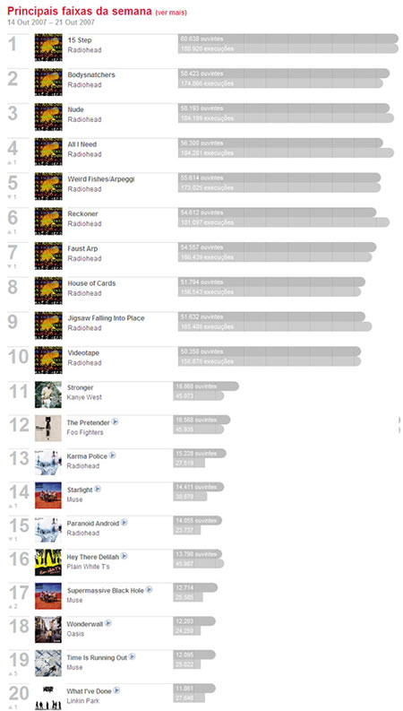 O Top Ten de músicas da Last.FM exibe as dez faixas de “In Rainbows” na ordem que as músicas aparecem no álbum. “15 Step” aparece novamente no topo com 188 mil execuções (263 mil na semana passada) divididas entre 60 mil ouvintes. Na categoria “artistas”, o Radiohead lidera com 2.600 milhões de execuções; Beatles aparece em segundo com 870 mil execuções depois Red Hot Chilli Peppers com 498 mil.