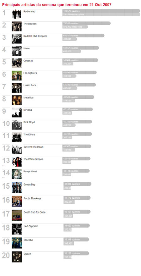 Mas ainda não é isso que me impressionou: o Radiohead lidera a semana com 118.836 ouvintes diferentes que escutaram 3.308.175 de vezes canções do Radiohead (e ai incluimos todos os discos do Radiohead que foram ouvidos na Last.Fm semana passada). Sabe quem aparece em segundo lugar? Beatles! Quando demonstrei minha surpresa para o meu amigo, ele retrucou: “Mas os Beatles lideram toda semana!”. E eu achando que ninguém ouvia Beatles hoje em dia…