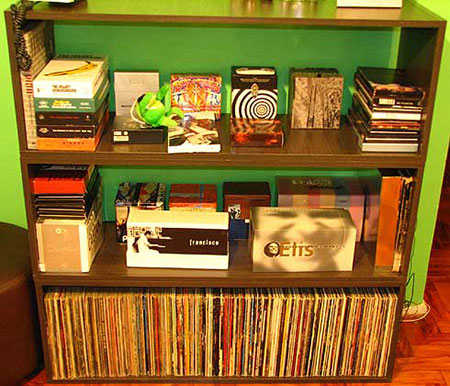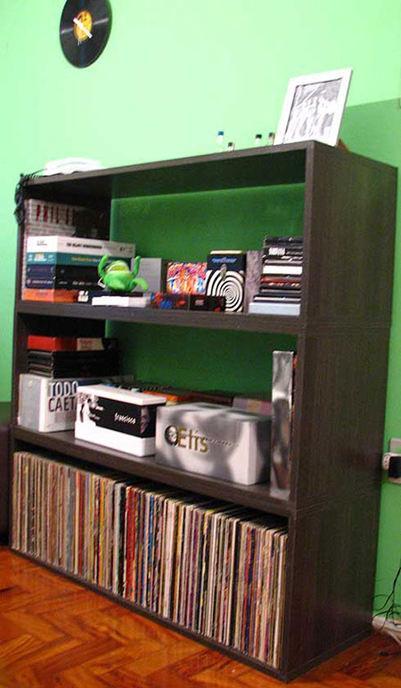 Para facilitar (sic), claro, pedi que uma das estantes tivesse um espaço maior para os DVDs. E também disse que queria alguns caixotes para os vinis e os boxes. A idéia era fixar as estantes na parede, e colocar os caixotes embaixo, formando tudo um móvel único. No entanto, com as peças em casa, descobrimos que os caixotes funcionavam bem na parede verde (eu já disse algum dia que Lili me fez pintar a parede da sala de jantar de verde? Bem, ela fez), além de poderem ficar ajeitados de diversas formas. Na foto está o formato padrão.
