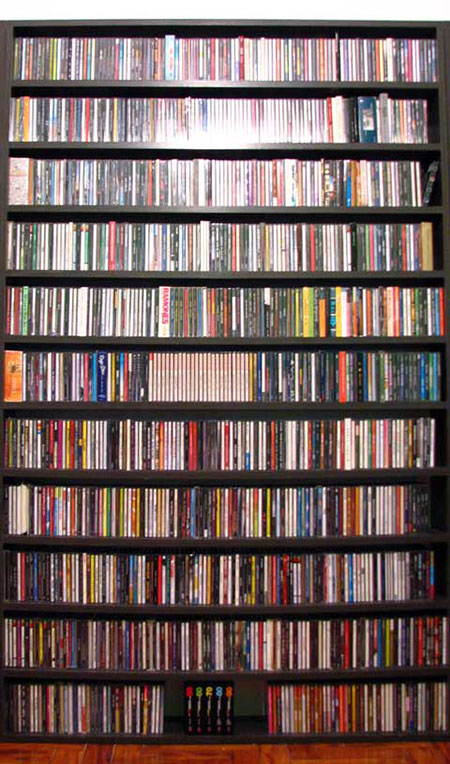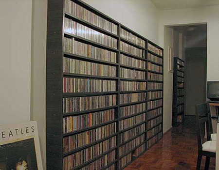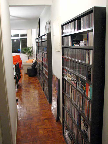 Três estantes de CDs ocuparam toda a parede da sala de jantar. A quarta ficou no corredor, frente à porta da cozinha, e além dos CDs também recebeu DVDs. Como organização ficou perfeito. Os CDs, agora, se encontram todos juntos, divididos em nacional e internacional, seguindo uma ordem alfabética, com exceção para as coletâneas, trilhas sonoras, tributos e discos que ainda preciso ouvir, que ficaram na estante do corredor, que também tem DVDs, mais de 100 CDs de MP3 e, acredite, VHS (além do pen-drive contendo o álbum “A Marcha dos Invisíveis”, do Terminal Guadalupe: nunca uma estante juntou tantas mídias – risos).