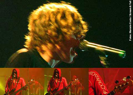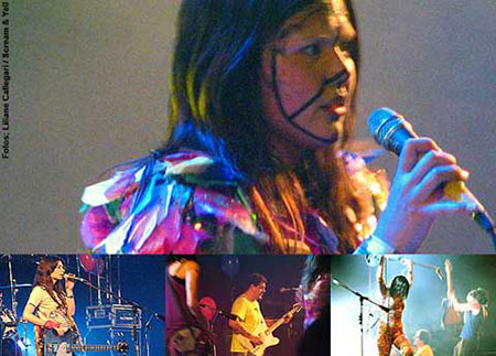 Tokio Police Club (foto maior) e Datarock (fotos menores) fizeram um barulho dos diabos no palco Indie do festival. Apesar do som embolado, o Tokio Police Club soou interessante, mas o máximo que se pode dizer da apresentação é que foi correta. Fresquinho que é no cenário pop, o Tokio Police Club podia fazer uma noite antológica na Funhouse, n’a Obra, no Teatro Odisséia ou no 92 Graus. Num festival eles são apenas um passatempo barulhento, o que não deixa de ser ok. Já o Datarock pareceu mais bem encorpado e mais pesado que nos MP3 que circulam por ai. Não vale a comparação – na brincadeira – com o Sepultura perpretada pelo vocalista, mas é uma boa diversão.