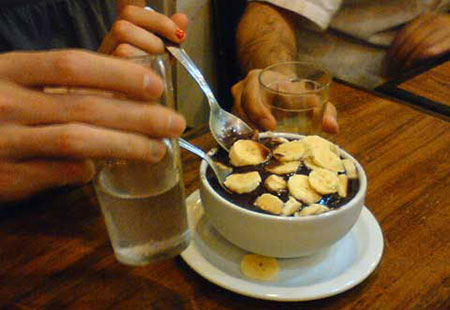 A Juliana não quis nem saber (depois, aprovou). O Guto protestou contra o uso de banana e granola. Eu, Jonas, Renata e Ligelena nem ligamos e aprovamos a mistureba toda. Depois que “bebemos” a primeira cumbuca na colher (com uma senhora dose de vodka), pedimos outra, que atendendo aos pedidos do Guto, veio sem granola, mas com banana. Desceu tão bem que já virou um dos pratos especiais do reveillon da turma.