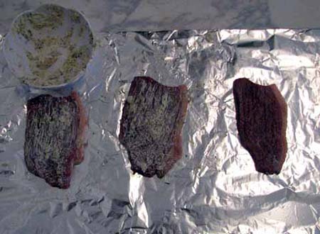 Triturar as ervas provance com a salsinha e o alho. Acrescentar o sal e a manteiga formando uma pasta. Envolver o bife nesta pasta e embrulhar em papel alumínio deixando o lado do papel mais laminado para dentro. Assar sobre a grelha na churrasqueira, alternando os lados do bife. Pronta, exalará um aroma inconfundível. Servir com o arroz branco para poder apreciar o sabor das ervas com maior clareza.