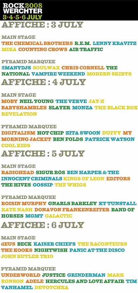 No começo de março postei o line-up do Rock Werchter, festival que irá acontecer de 03 a 06 de julho em uma cidadezinha pertinho de Bruxelas. Ontem foi anunciado que Raconteurs e Gnarls Barkley vão engrossar o line-up que já tinha R.E.M., Radiohead, Neil Young, Beck, Chemical Brothers, Soulwax, Verve, Babyshambles, Hives, Editors, Gossip e Kaiser Chiefs, entre outros. Então fui olhar novamente o line-up no site oficial, e não é que existem mais nomes que eu não sabia que já tinham sido confirmados: Vampire Weekend, Ben Folds, Slayer, My Morning Jacket e… Grinderman!!!! Abaixo, o line-up atualizado e meu pré-roteiro de viagem.