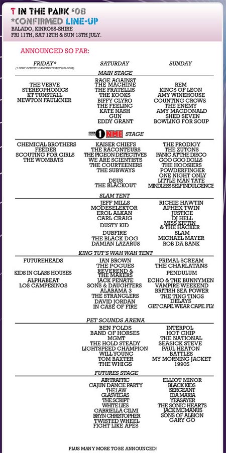 Destaques deste ano: The Verve, Stereophonics, Rage Against the Machine, The Fratellis, The Kooks, R.E.M., Kings of Leon, Amy Winehouse, The Chemical Brothers, Kaiser Chiefs, The Raconteurs, We Are Scientists, Panic at the Disco, The Futureheads, Ian Brown, The Pogues, Primal Scream, The Charlatans, Echo & The Bunnymen, Sons and Daughters, Vampire Weekend, British Sea Power, Aphex Twin, Miss Kittin & The Hacker
