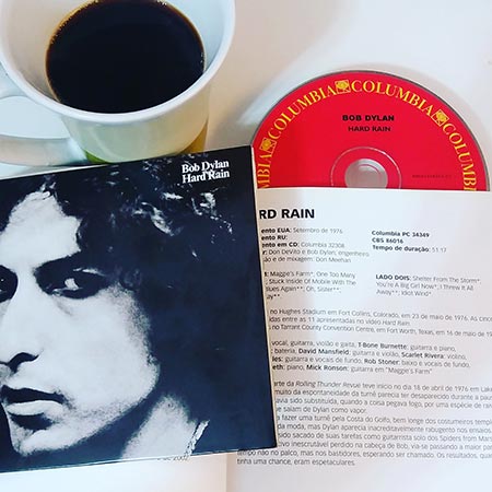 Bob Dylan com café, dia 19 – recapitulando o café de ontem: em julho de 1975, Dylan entrou em estúdio e gravou o álbum “Desire”. Em outubro saiu em turnê (a Rolling Thunder Revue) com sua trupe cigana rock n’ roll para divulgar o álbum, que só seria lançado em janeiro de 1976 (isso mesmo, ele saiu em turnê sem um disco para divulgar). Os shows duravam de 3 a 4 horas por noite seguindo a rotina: Bob Neuwirth fazia seu set, T-Bone Burnett dava um pitaco, Dennis Hopper declamava um poema, Mick Ronson (que havia deixado a banda de David Bowie para acompanhar Dylan) tocava “Life On Mars” e Bob Dylan então surgia para um set acústico. Meia hora depois, Roger McGuinn assumia o lugar de Dylan, tocava algumas coisas do Byrds e passava a função para Joan Baez, que tocava durante cerca de 40 minutos. Dylan então voltava para encerrar a noite em formato banda com mais uma hora de show! Deu tudo certo na primeira perna da turnê (de outubro a dezembro), e o registro animado pode ser conferido no volume 5 das Bootlegs Series. Porém, “Desire” saiu em janeiro e em abril começou a segunda perna da The Rolling Thunder Revue com um Bob Dylan endiabrado e de péssimo humor em shows mais tensos. O registro dessa segunda parte da turnê é este “Hard Rain”, CD lançado em setembro de 76 (e que também é um especial para TV que você assiste abaixo).