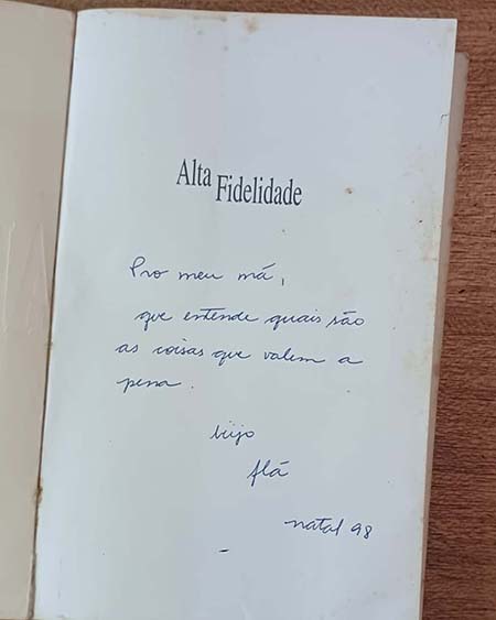 “Sou (meio) anti hype: Se está todo mundo falando pra ir prum lado (e ouvir um disco, ler um livro), costumo ir pro outro. Todo mundo falava que eu devia ler ‘Alta Fidelidade’, mas foi a Flavia que me mandou com essa dedicatória…”